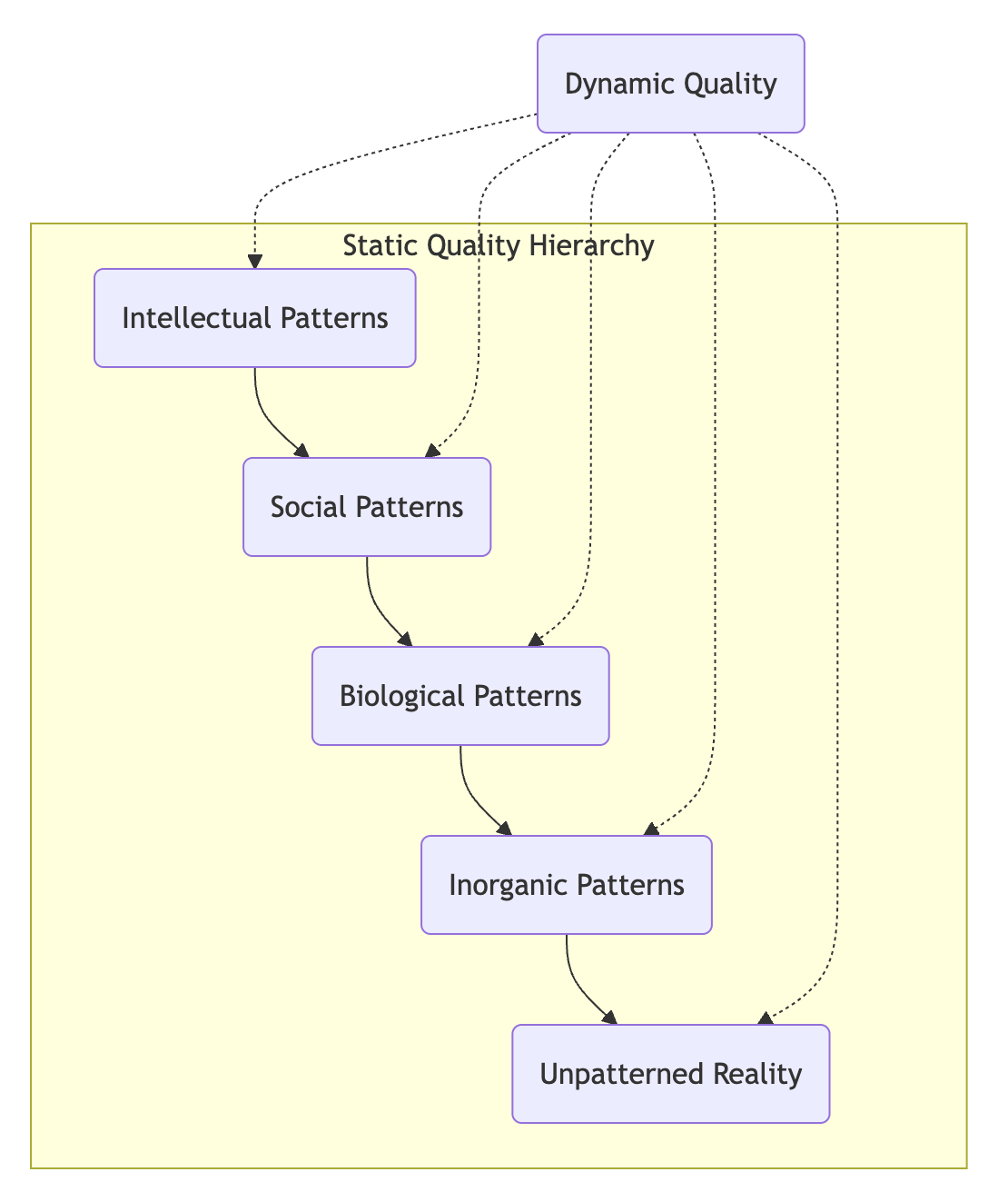 Dynamic Quality (DQ): The pre-intellectual cutting edge of reality, the source of all things. Pure, unpatterned experience. The moment of breakthrough. The unexpected solution. The rule that gets broken because breaking it works better. DQ cannot be defined because definition itself imposes static patterns onto fluid reality.